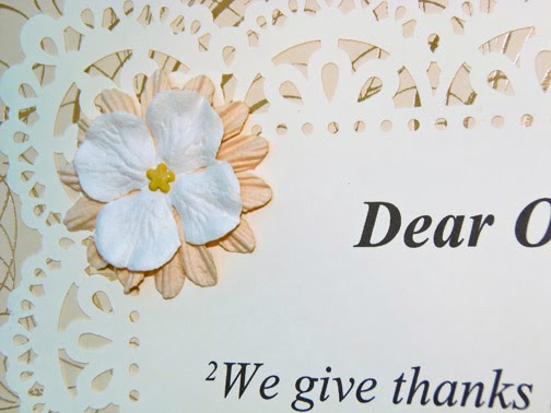 Within about five minutes of entering the store, I knew precisely what I wanted to do. I found a beautiful, decorative designer paper for the base of the card - and then chose a lovely die cut paper upon which to print a verse of scripture. I purchased a piece of 12" x 12" chipboard to mount the card on, and purchased a couple of sheets of plain cardstock for signatures on the back. When I got home, I dusted off a display easel that I've had for many years.